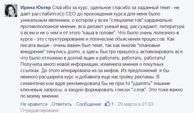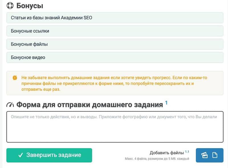 К каждому занятию идет домашнее задание, которое необходимо будет выполнять на своем сайте, а также внедрять в рамках своего бизнеса. Вы сможете за время курса добиться значительных успехов не только в получении теоретических знаний, но и в продвижении своего сайта и расширении бизнеса.